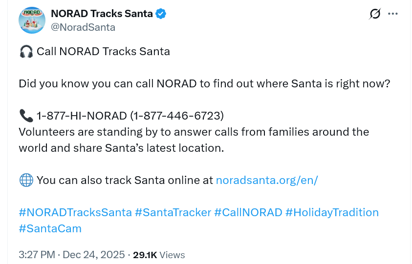 NORAD Tracks Santa Call Center Update: “We’ve now received more than 100,000 calls from families around the world tracking Santa’s journey tonight. Thank you to our volunteers who are answering phones and helping keep this holiday tradition going strong.”
