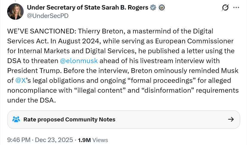 “The State Department is taking decisive action against five individuals who have led organized efforts to coerce American platforms to censor, demonetize, and suppress American viewpoints they oppose. These radical activists and weaponized NGOs have advanced censorship crackdowns by foreign states—in each case targeting American speakers and American companies. As such, I have determined that their entry, presence, or activities in the United States have potentially serious adverse foreign policy consequences for the United States.”
