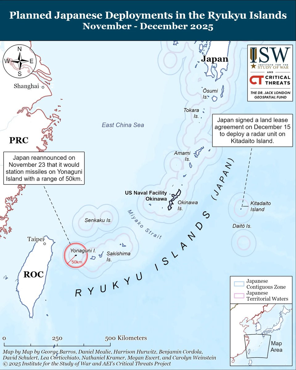 ISW: The PRC criticized Japan’s plans to increase its military footprint on remote islands. Japanese media reported that the Japanese Ministry of Defense has signed a land lease agreement to deploy a radar unit on Kitadaito Island, the easternmost island of Okinawa Prefecture.