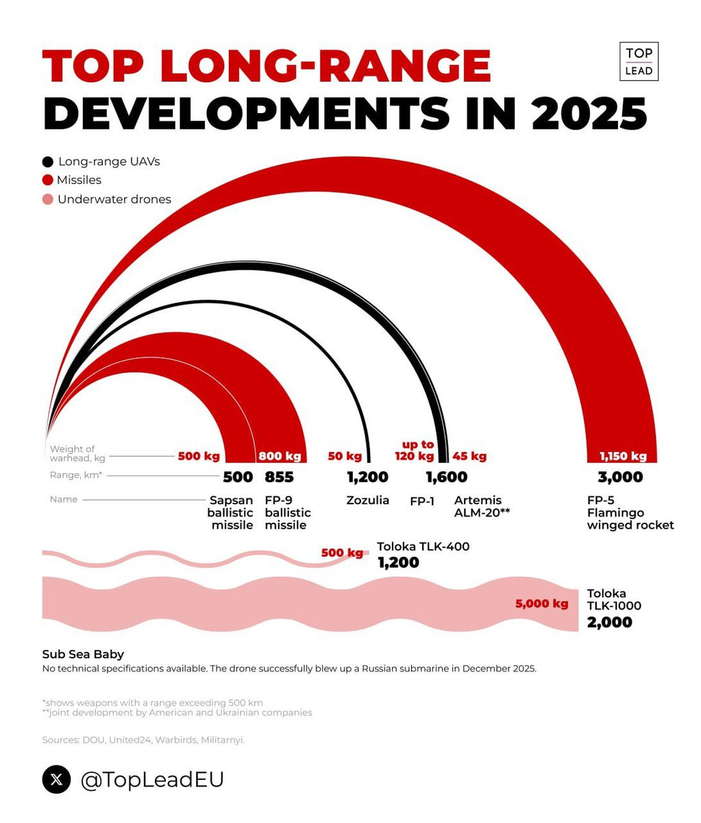 Missiles up to 3,000 km, drones reaching 1,600 km, and sea platforms up to 2,000 km. This is no longer experiments — it's a full multi-domain deterrence system across air, land, and sea. Hundreds of millions of dollars go into R&D, testing, and scaling every year. In 2026 the focus will shift to mass production, higher precision, and reliability — making deep strikes a constant factor on the battlefield.