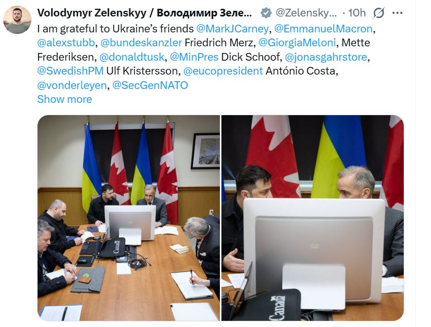 Leaders on the video call: Emmanuel Macron (France); Alexander Stubb, (Finland); Friedrich Merz (Germany); Giorgia Meloni (Italy); Mette Frederiksen (Denmark); Donald Tusk (Poland); Dick Schoof (the Netherlands); Jonas Gahr Støre (Norway); Ulf Kristersson (Sweden); António Costa, President of the European Council; Ursula von der Leyen, President of the European Commission; Mark Rutte, Secretary General of NATO; and Jonathan Powell, UK National Security Adviser.