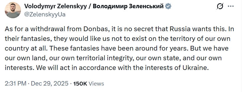 The Kremlin’s position was reiterated in Alaska in August 2025, and once again (just in case you missed the other 50 times) in the run up to these ‘negotiations’ by Russia’s foreign minister, the deputy foreign minister, Russian state propagandists and proxies as well as by Steve Witkoff, the American real estate dealer (video timestamp: 55:00-1:26:00).