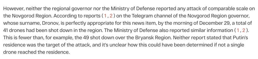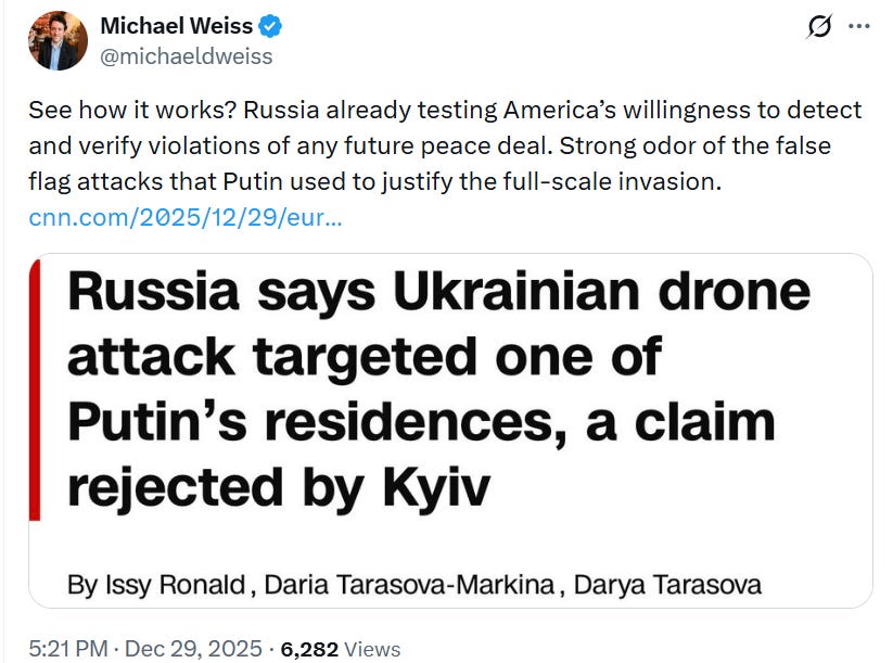 Michael Weiss: On Dec 29 Trump said he and Putin bonded over their shared denial that the GRU interfered in the U.S. presidential election in 2016, one of the most well-documented events of that year. Today Trump credits Putin's claim that Ukrainian drones targeted Putin's residence in Novgorod, even though Russia's MoD and the Novgorod regional governor had no information about any such attack.