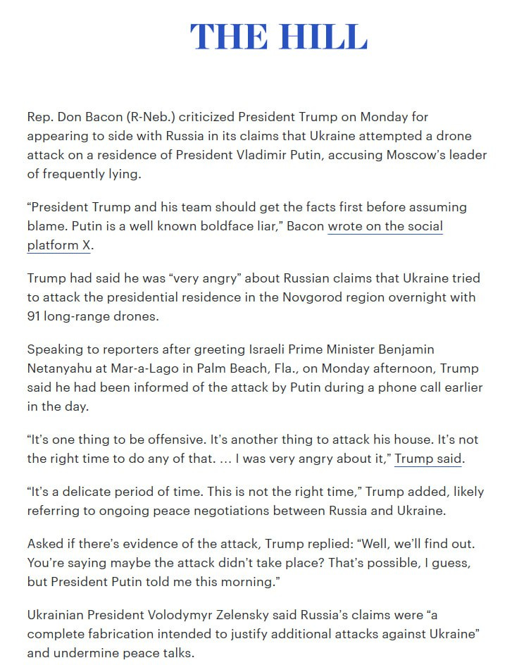 U.S. Rep. Don Bacon criticized President Trump over his reaction to Russia’s claim of a Ukrainian drone attack on Putin’s residence. “Trump and his team should establish the facts first before jumping in. Putin is a known, shameless liar,” Bacon said.